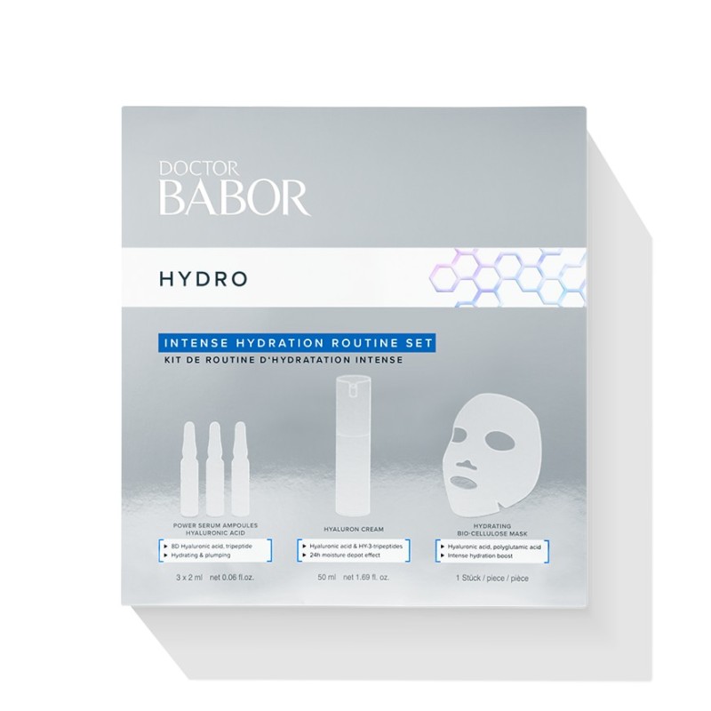 Dehydrated skin appears dull, tired, and dry, often showing visible fine lines or dryness wrinkles. The DOCTOR BABOR INTENSE HYDRATION ROUTINE SET helps restore radiance and vitality, deeply hydrates (stimulates hyaluronic acid synthesis), provides intense and long-lasting moisture, and protects against future moisture loss by strengthening the skin’s natural protective barrier.