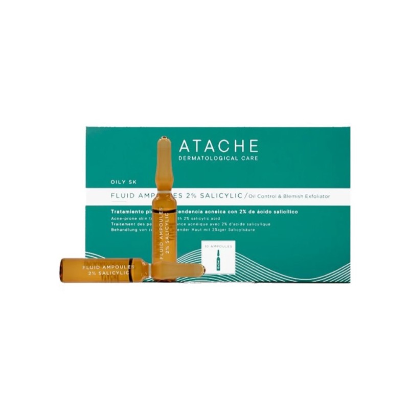 ATACHE OILY SK FLUID AMPOULES 2% SALICYLIC – veido ampulės su 2 % salicilo rūgštimi, skirtos riebiai, mišriai ir į netobulumus linkusiai odai. Koncentruota formulė padeda švelniai eksfolijuoti odos paviršių, pašalinti susikaupusius nešvarumus ir suteikti lygesnės bei gaivesnės odos pojūtį.